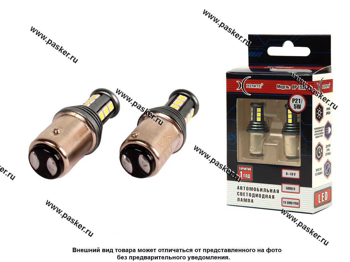 Двухконтактные светодиодные лампы Xenite BP1530 P21\5W ярче галогена в 2 раза и отличное решение для вашего автомобиля. Диодные лампочки идеально подходят для использования в качестве стоп-сигнала, заднего хода, дневных ходовых огней (ДХО) или дополнительного света. Обеспечивают яркое освещение благодаря современным ярким диодам, а температура света 5000K дает чистый белый свет. LED лампы подходят для различных моделей авто и могут быть использованы в качестве запчастей для ТО, что делает их универсальным выбором для автолюбителей. Долговечность и энергоэффективность светодиодов позволяет сократить расходы на замену и обслуживание. Светодиодные лампочки не перегреваются. Комплект из 2 штук, что позволяет легко обновить штатное галогеновое освещение сразу с обеих сторон вашей машины. Гарантия 1 год. Диоды - биполярны, что упрощает процесс установки.